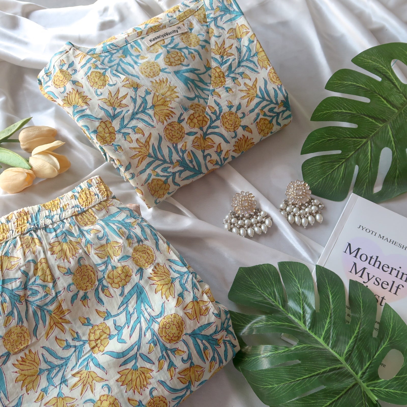 This pure cotton kurta pants set showcases a vibrant Designed in an elegant Alia cut frock style, the kurta features a flattering silhouette with no side slits and comfortable 3/4th sleeves, making it a versatile choice for both casual outings and special occasions.