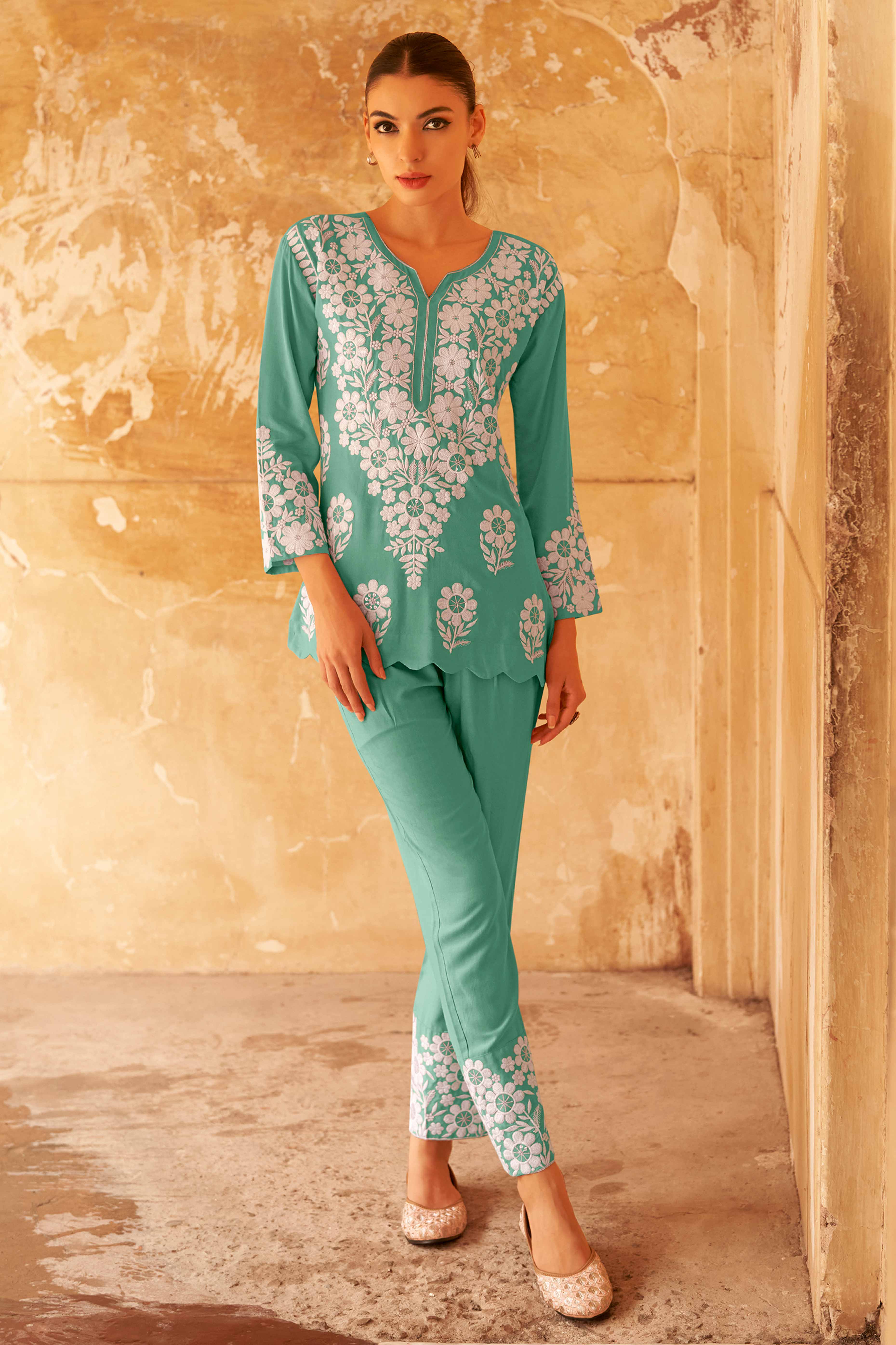 Elevate your daily wardrobe with this rama green co-ord set, beautifully detailed with delicate floral embroidery for a modern and refined look. The coordinated design creates a flattering silhouette that combines comfort with effortless style.